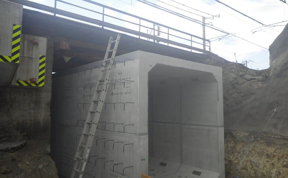 ボックスカルバートの縦方向にはPC鋼棒による縦締め施工を行い、連続性を確保しています。